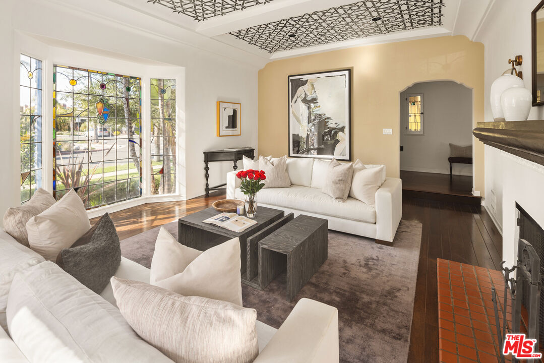 This stunning 1934 Spanish Colonial Revival 'Mills Act' property features so many incredible details, you must visit to experience its architectural delights! The house, which sits on a corner lot, was built by Spyros Ponty as a showcase home for the then burgeoning neighborhood development. A dramatic entryway with 15-foot ceiling leads to an expansive living room with stenciled ceilings, a large fireplace, a beautiful stained glass window and original hardwood flooring. The dining room, which overlooks the front courtyard fountain, is unique for its detailed moldings and specialized plaster work and is separated from the kitchen by an elaborately carved wooden door. The well-appointed kitchen was designed for entertaining with a dining area, luxury appliances and plenty of storage. Across from the dining room, you will find a cozy den with a fireplace, built-in library nook and French doors leading to the South courtyard with its mosaic details and a third fireplace. The large atrium at the center of the home features an elaborate stained-glass skylight and connects three sizable bedrooms, two with ensuite baths. The primary suite accesses the extra-large primary bath with original Art Deco tiling, and has built-in cabinets, a sizable walk in closet and French doors overlooking the pool. The backyard was recently updated with a resurfaced pool, flagstone patio and a luxury built-in grill and wine fridge next to a covered pergola. Don't miss this opportunity to live in the heart of Los Angeles close to Beverly Hills, Culver City, LACMA, and the Farmers Market, while enjoying the substantial Mills Act property tax savings linked to this home.